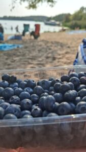Heute kaufen wir Leinöl und einen Buchweizensnack in Parchen, Heidelbeeren in Hohenseeden, die letzte Ernte. Dann lassen wir das Hörgerät der Oma prüfen und holen Wasser im Supermarkt. Später fahren wir nach Möser und machen einen kleinen Waldspaziergang. Es einen Eisbecher zum Mittagessen. In Burg trinken wir Kaffee mit der Oma. Danach geht’s baden im Niegripper See. Eine tolle Erfrischung bei 34 °. Abends essen wir Pizza bei Freunden in Schermen. Ein ereignisreicher Tag.