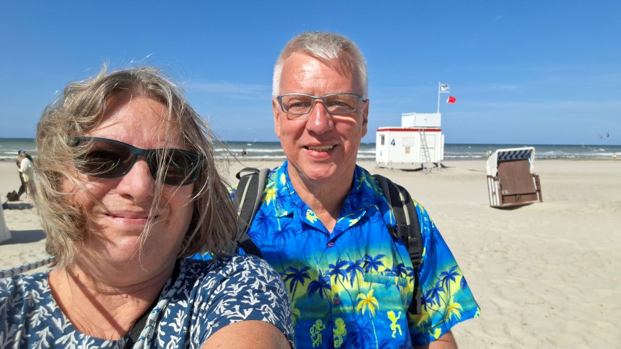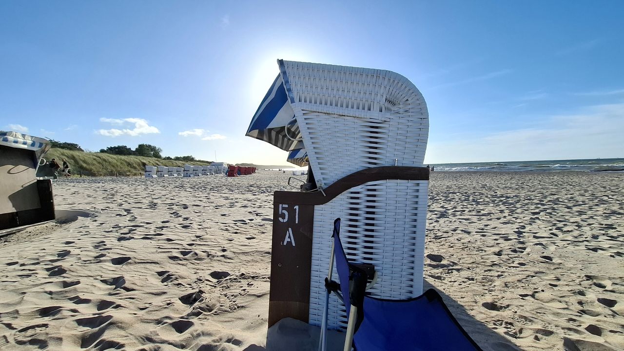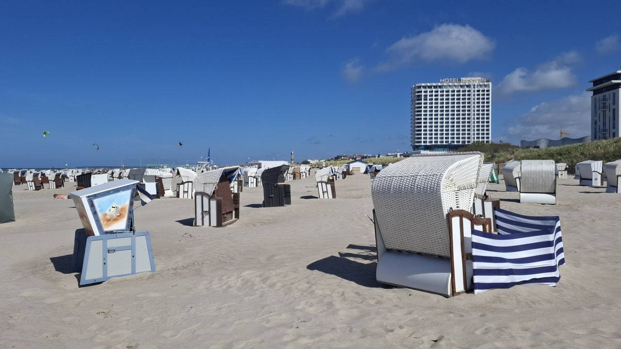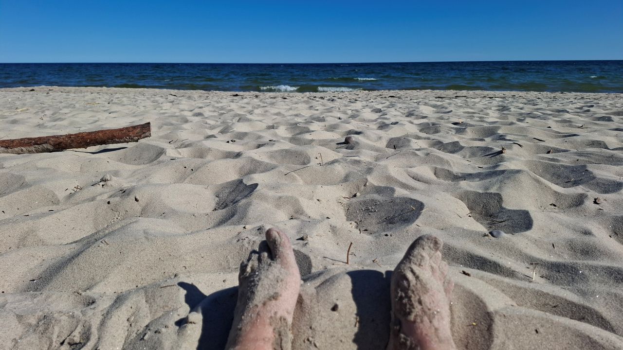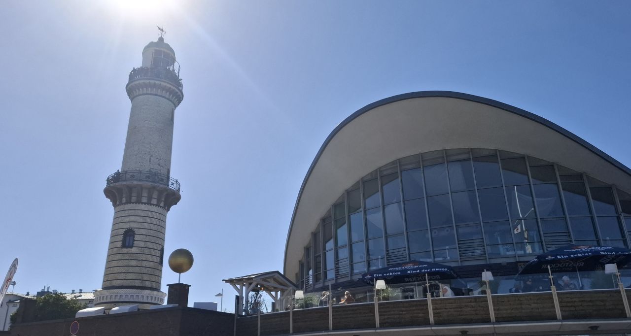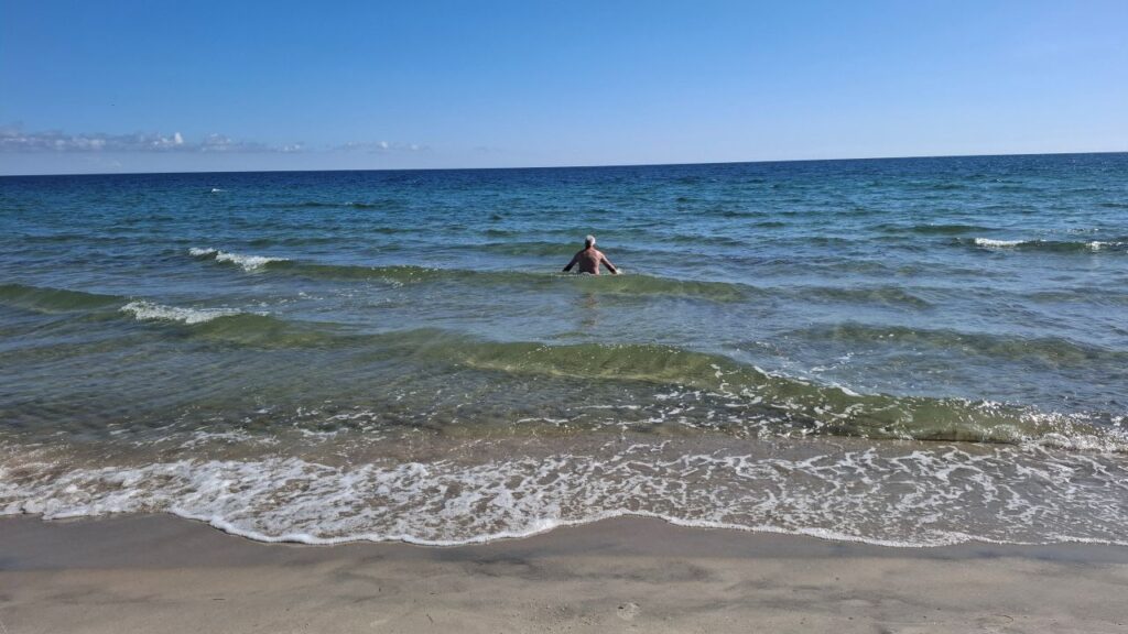 Nach einer kurzen Verabschiedung von der Oma und einer Aufstockung unserer Verpflegung geht es gen Norden. Wir fahren nach Warnemünde. Parken gibt es in der Nähe unserer Ferienwohnung von vor Jahren. Nun erst einmal am Strand entlang zum Strom und ein Fischbrötchen essen. Lecker! Es ist ganz schön voll hier. Die Temperaturen sind angenehm aber der Wind geht und die roten Fahnen sind gehisst. Ein kleiner Einkauf bei Skandik vervollständigt meine Garderobe. Wir suchen uns einen Platz zum Kaffee trinken. Wir werden fündig in der Hafenliebe. Es gibt Kaffee und Cheesecake und danach noch ein Glas Rotwein. Dann holen wir uns nochmals Fischbrötchen zum mitnehmen. Wir holen die Stühle aus dem Auto und setzen uns an den Strand. Ein paar mutige gehen baden.