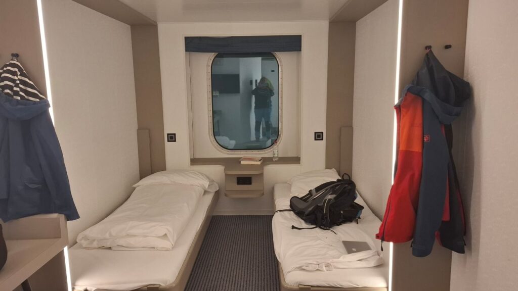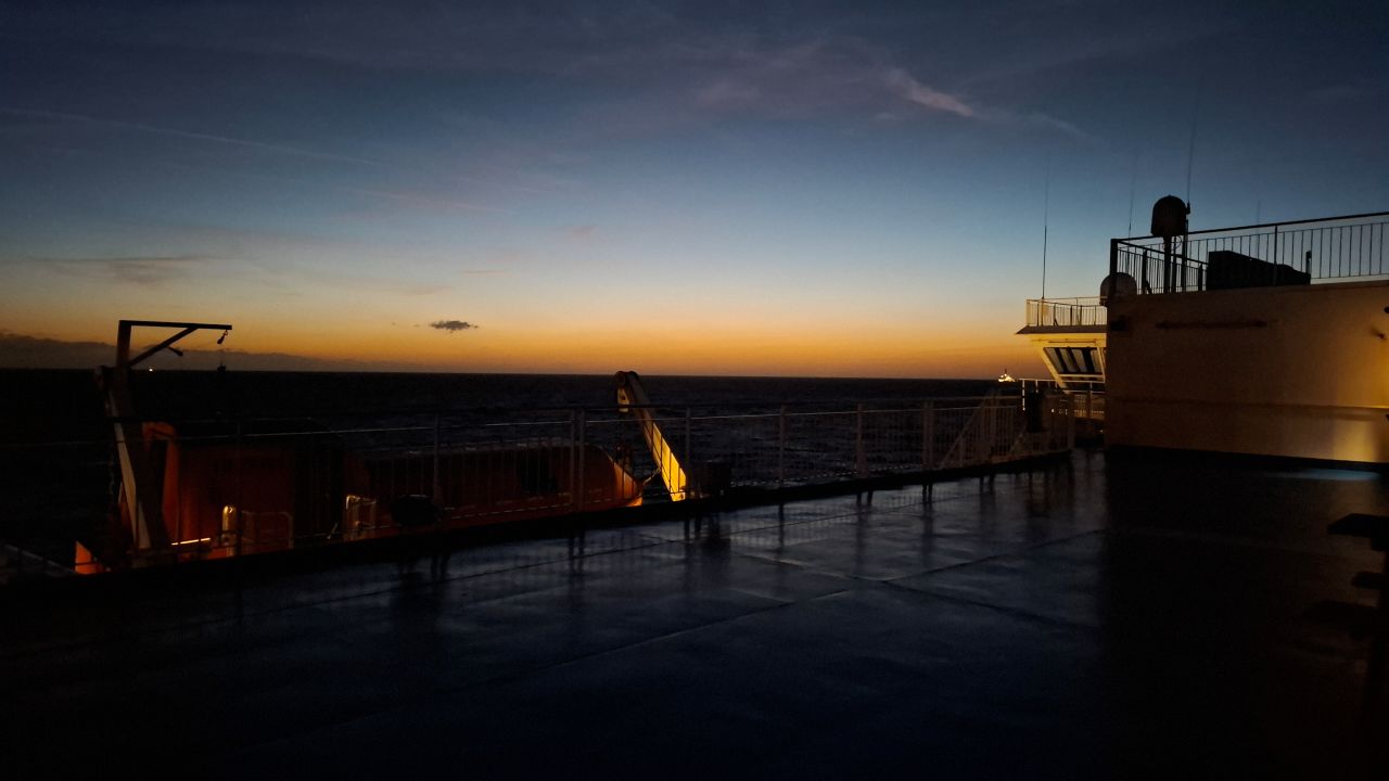 Dann bekomme ich eine Email von der TT-line. Unsere Fähre geht 2 Stunden später. Also statt 23.30 erst 1.30. Puh, was bis dahin tun? Online umbuchen geht nicht mehr. Telefonisch erreicht man auch niemanden mehr. Na gut, das Parkticket ist eh abgelaufen. Also fahren wir zum Ableger. Dort sind erstmal nur Automaten und weitere aufgeregte Passagiere. Gemeinsam finden wir einen Weg. Am Fährzentrum gelingt es doch noch umzubuchen auf 21.30 Uhr. Als letzte, Glück gehabt. Wir können auch gleich einchecken und rauffahren. Alles gut. Es gibt Essen und die Zimmer sind dann auch fertig. Die Nacht wird kurz aber die Kabine ist ganz gemütlich. Es schaukelt fast gar nicht. Also schlafen wir ein wenig.