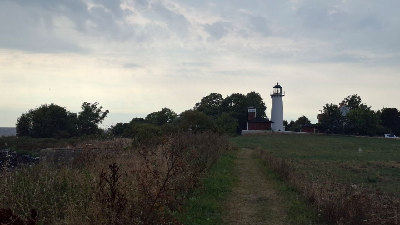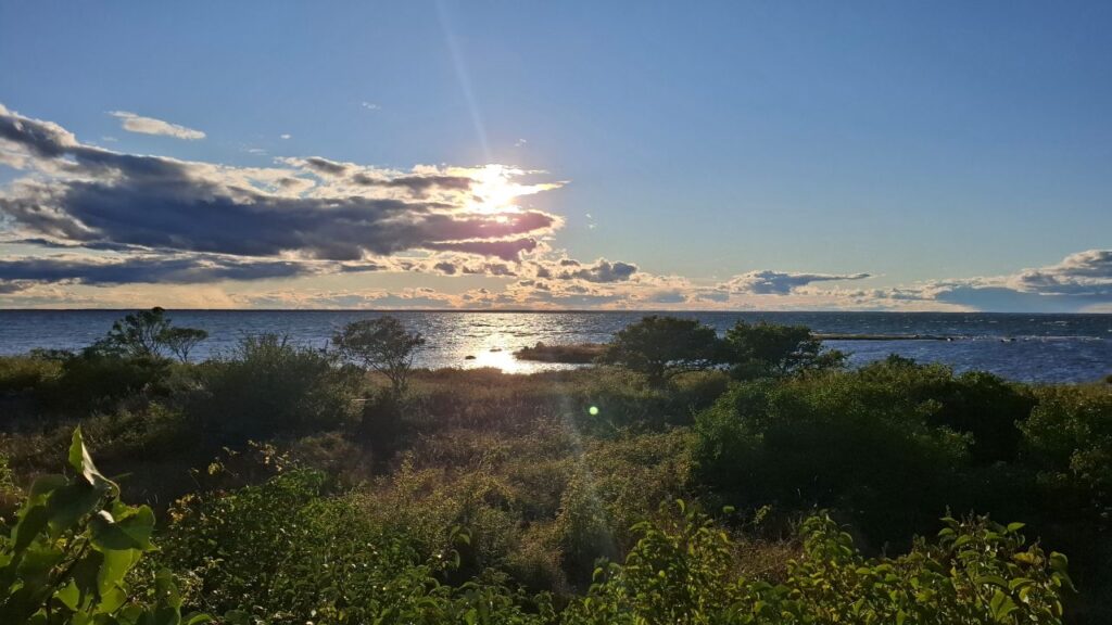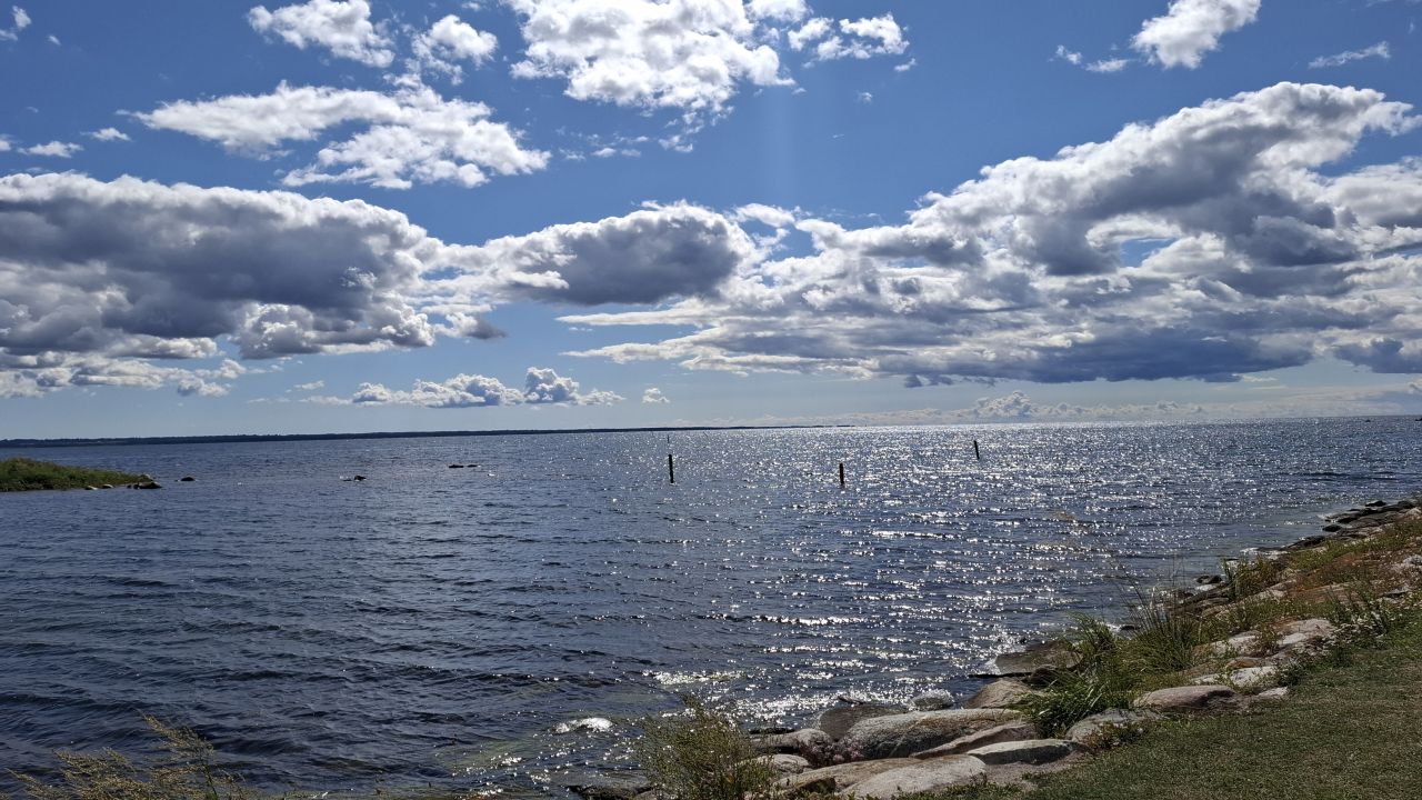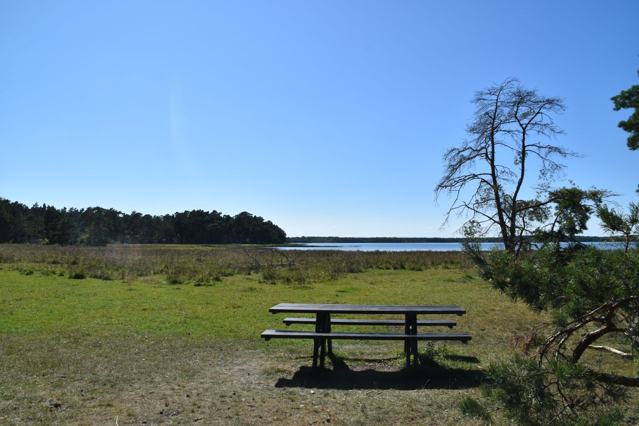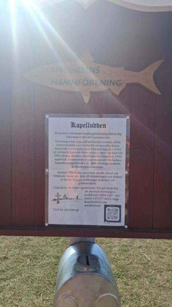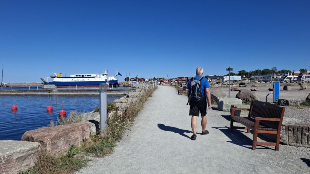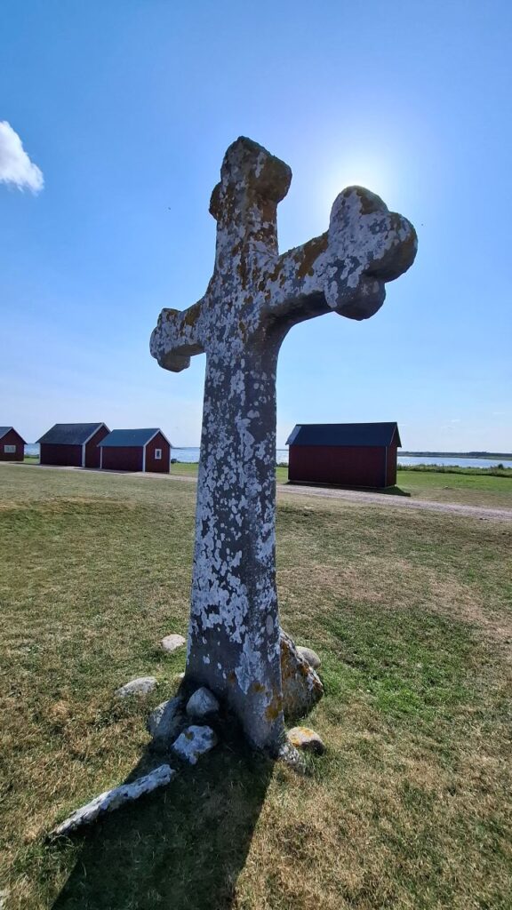 Dann fahren wir weiter nach Kapelludden. Ein Platz mit einer Ruine einer Kapelle und einem Kreuz. Es gibt ein paar Hütten und eine Leiter ins Meer zum Baden. Der Blick geht auch zu einem Leuchtturm. Eine schöne kleine Wanderung auch heute.