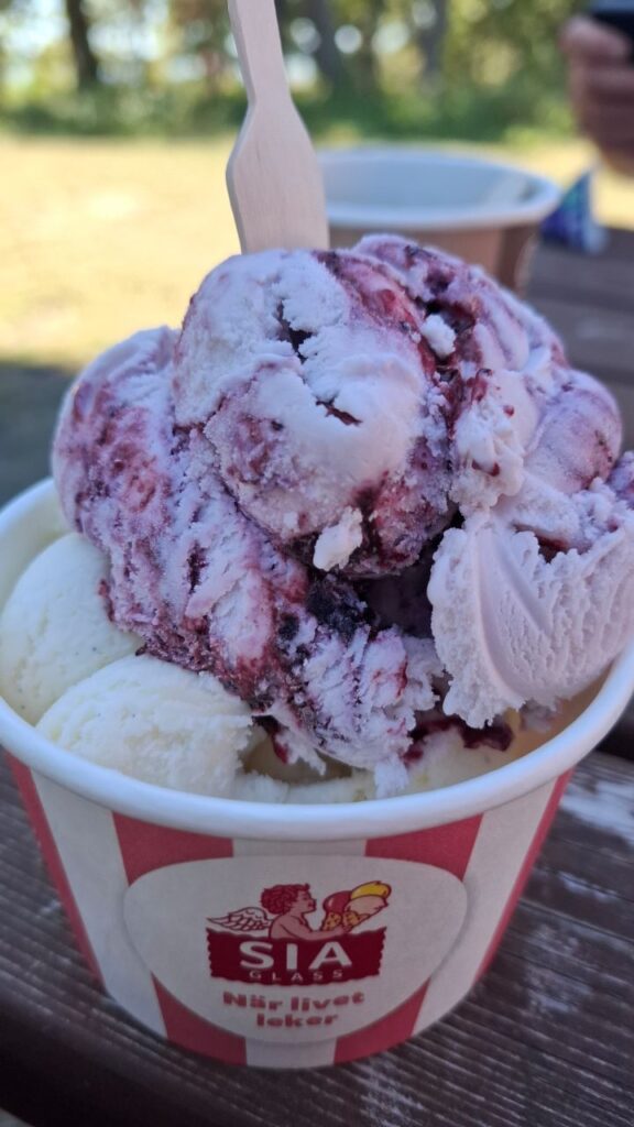 In Gränna werden wir von Menschenmengen überrascht. Wo kommen die bloß alle her? Wir wollen hier in das Museum Andreexpeditionen Polarcenter. Es geht um die Expedition wo André, Strindberg und Fränkel versucht haben den Polarkreis mit einem Ballon zu erreichen 1897. Leider lief die Expedition schief und keiner kam zurück. Später konnte man aber die Leichen und Dokumente und Fotos finden. Es ist sehr interessant. Dann kaufen wir noch Zuckerstangen für die Gränna berühmt ist. Es ist sonnig und warm. Also essen wir noch echtes italienisches Eis und trinken Kaffee in der Sonne.
