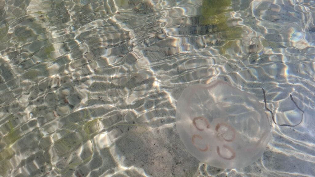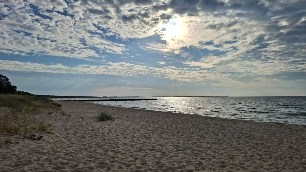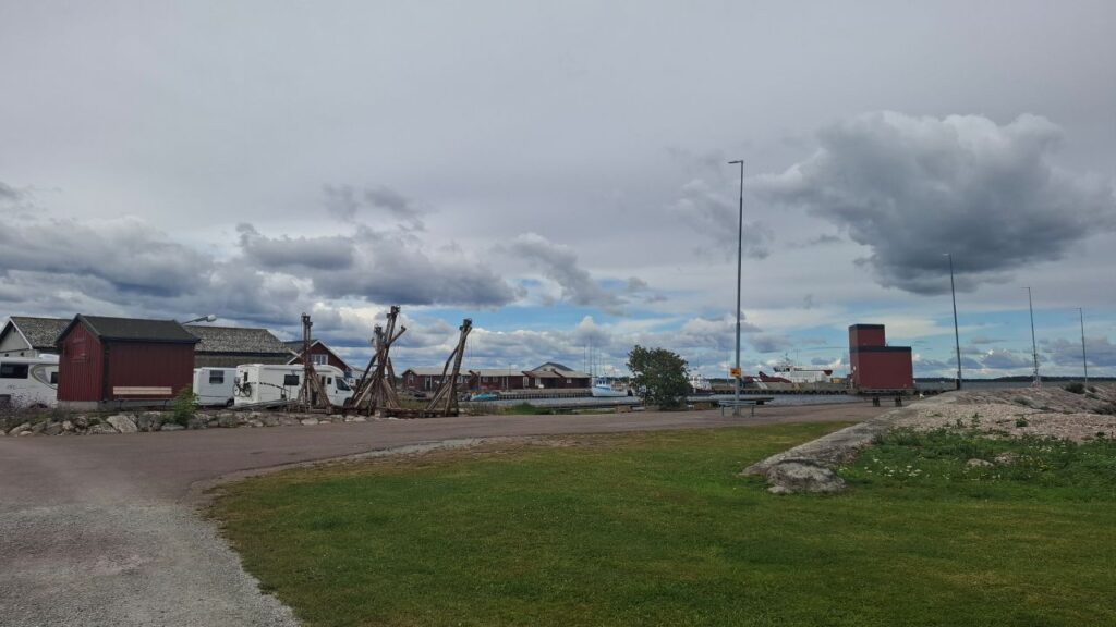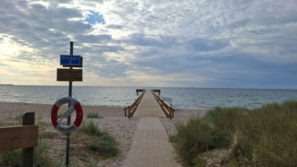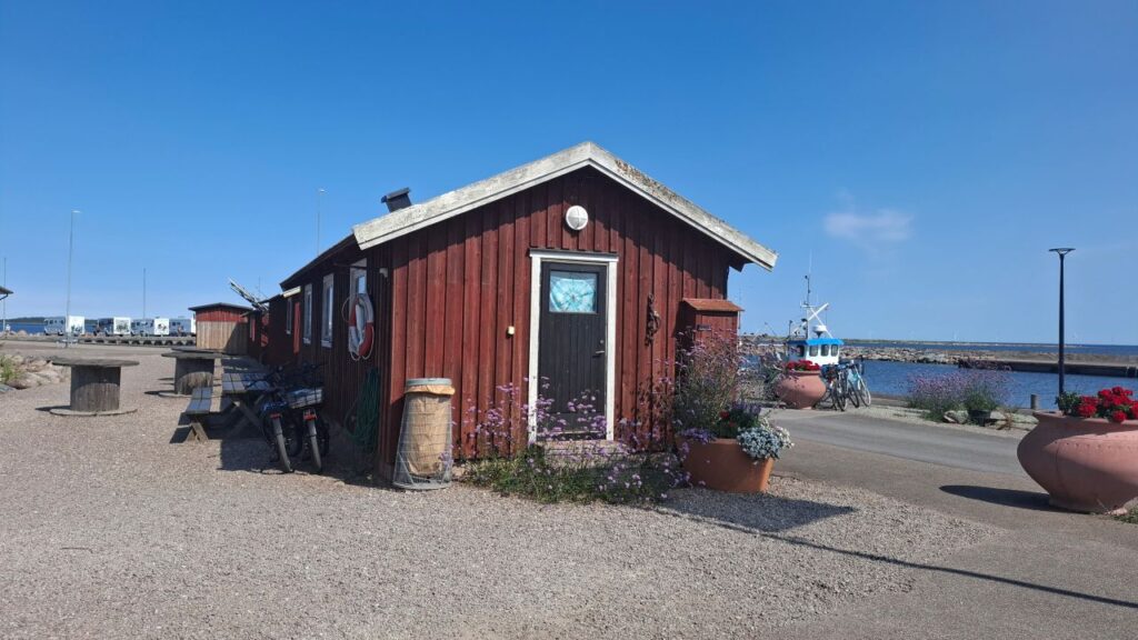 Dann fahren wir zu einem kleinen Hafen Karehamn. Dort gibt es Räucherfisch, Stellplätze für Wohnmobile und ein paar Hütten. Wir holen uns geräucherte Makrele und fahren zum Badeplatz bzw. zum Strand. Wir sitzen im Sand auf unseren Stühlen, essen den Fisch und Schwimmen um die Wette mit den Quallen in sehr flachem Wasser. Es sind 26° und somit ist es recht warm. Vielleicht den letzten Tag im Urlaub.