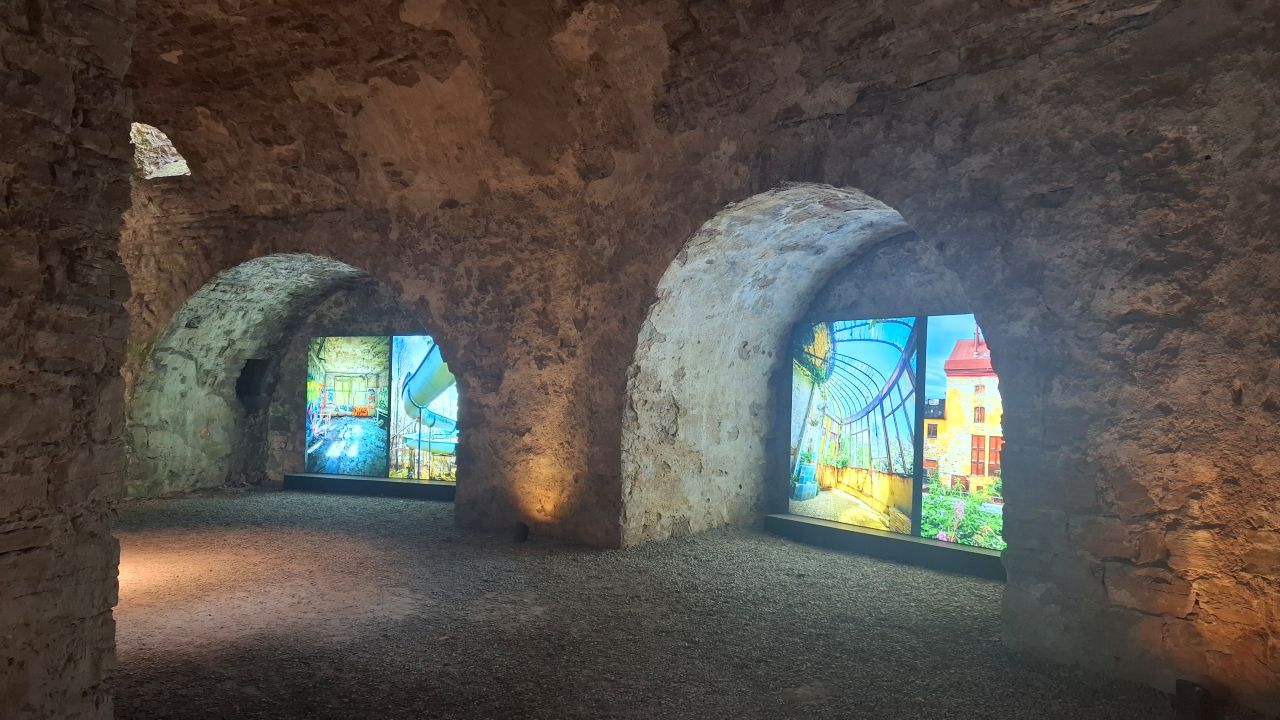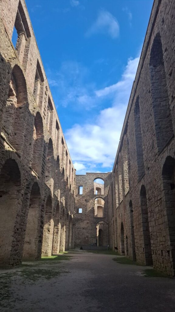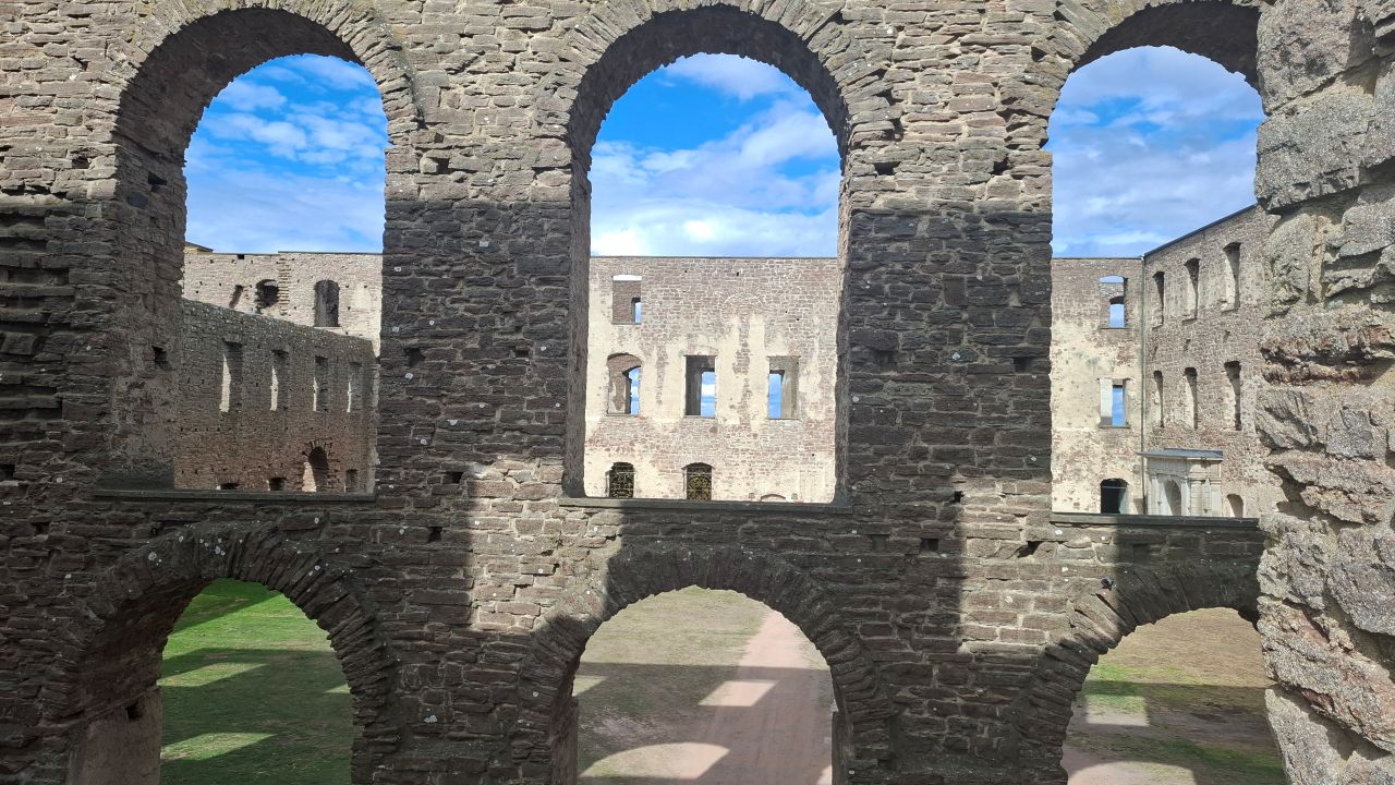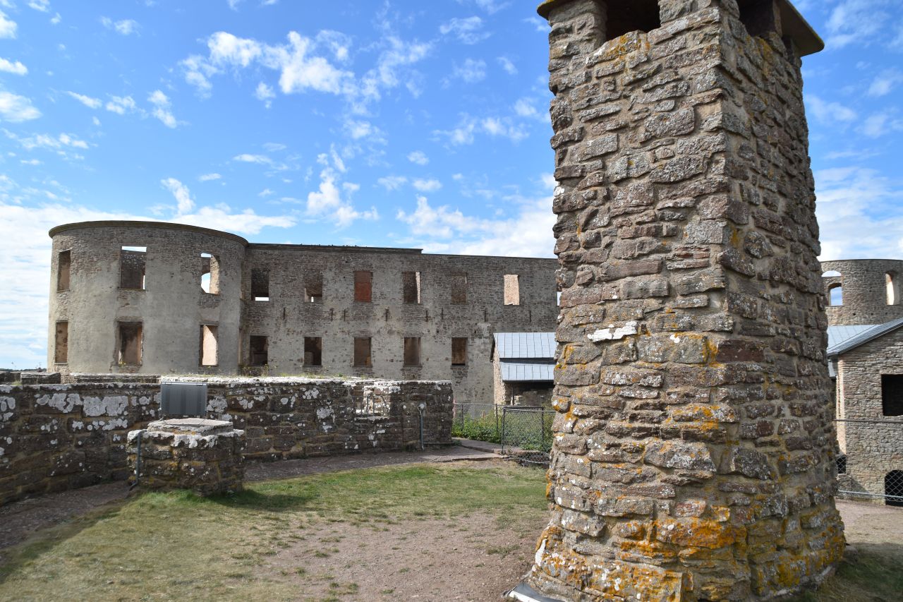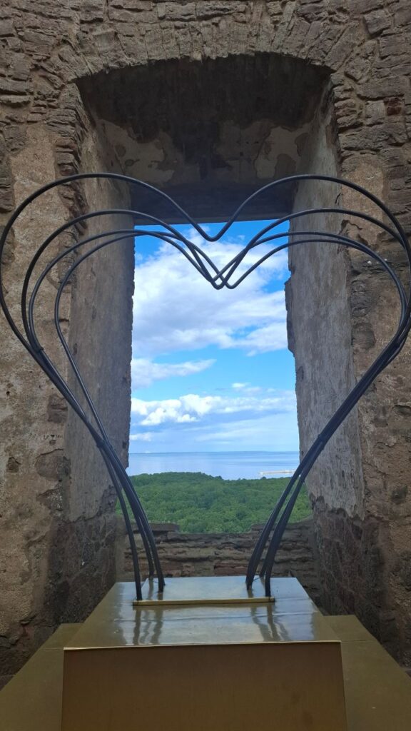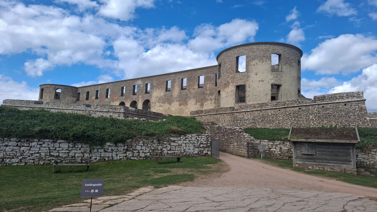 Es geht ein wenig durch den Wald und noch ein paar Treppen aufwärts. Dann stehen wir vor einer beeindruckenden Burganlage. Wir wandeln durch die Ruine und sind positiv überrascht. Es gibt eine Fotoausstellung über vergessene Plätze. Die Bilder sind echt gut. Für Kinder gibt’s ein Drachen-Spiel mit Rätsel lösen. Wir brauchen eine Weile um alles zu erkunden. Die Aussicht von oben ist wunderschön. Man sieht Borgholm und das Meer. Auch das Festland kann man sehen. Im Sommer gibt es hier wohl immer Konzerte. Bestimmt sind das tolle Events.