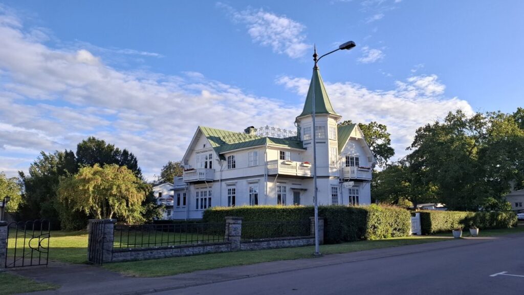 Dann fahren wir nach Huskvarna in das Slottsvillan Motel. Ein tolles Zimmer im Schlossgarten. Das Schlosshotel steht ein paar Meter weiter. Wir essen Steak und Schnitzel im Ort und begeben uns zurück.