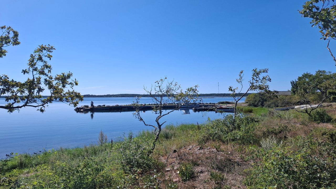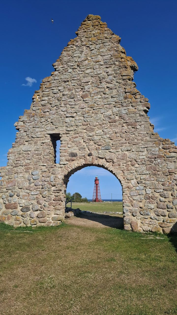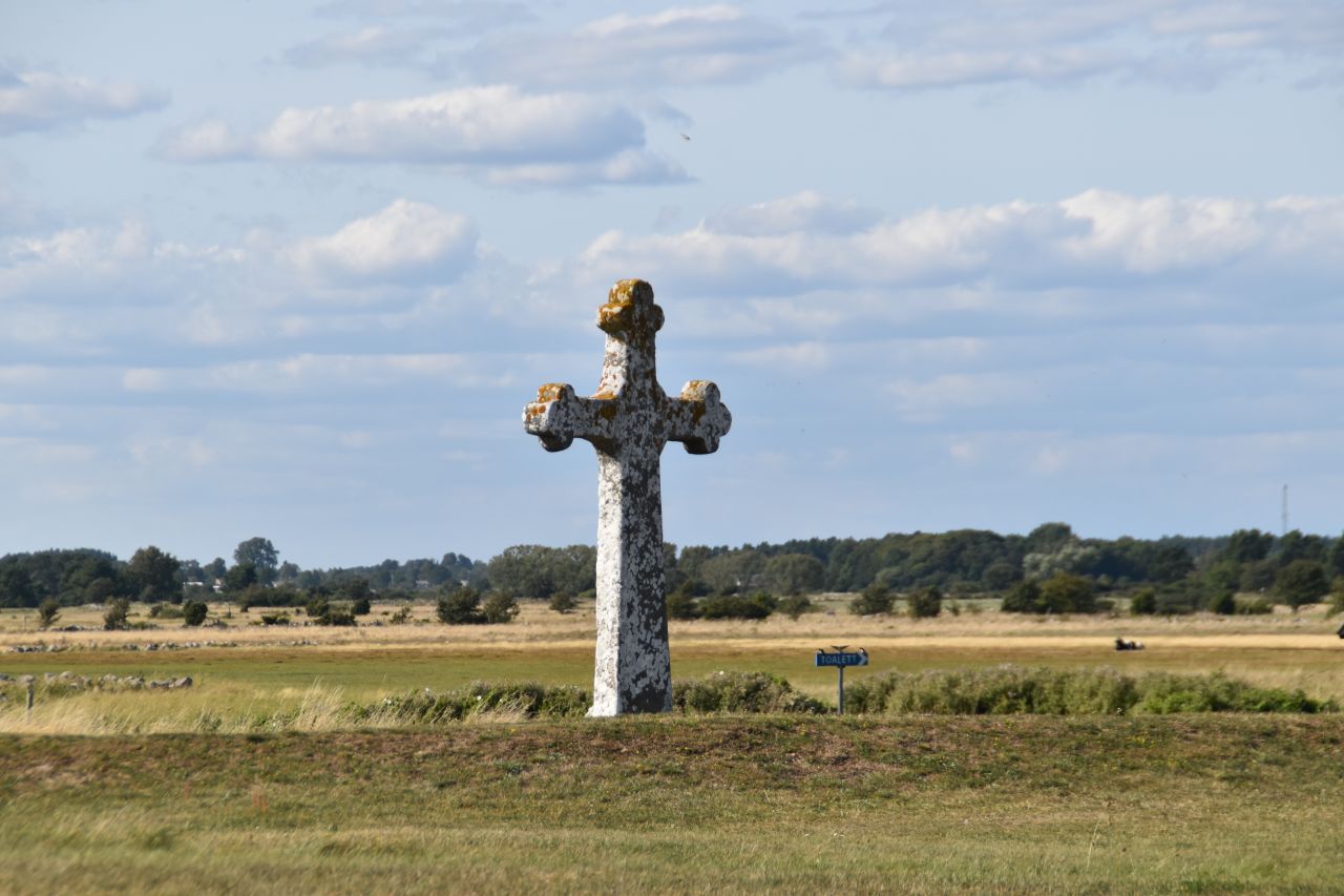 Dann fahren wir weiter nach Kapelludden. Ein Platz mit einer Ruine einer Kapelle und einem Kreuz. Es gibt ein paar Hütten und eine Leiter ins Meer zum Baden. Der Blick geht auch zu einem Leuchtturm. Eine schöne kleine Wanderung auch heute.
