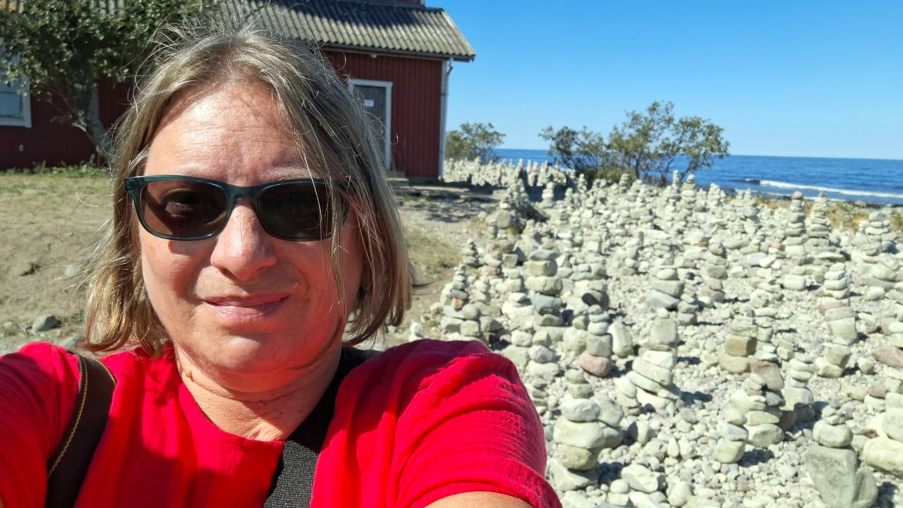 Dann fahren wir zu einem kleinen Hafen Karehamn. Dort gibt es Räucherfisch, Stellplätze für Wohnmobile und ein paar Hütten. Wir holen uns geräucherte Makrele und fahren zum Badeplatz bzw. zum Strand. Wir sitzen im Sand auf unseren Stühlen, essen den Fisch und Schwimmen um die Wette mit den Quallen in sehr flachem Wasser. Es sind 26° und somit ist es recht warm. Vielleicht den letzten Tag im Urlaub.