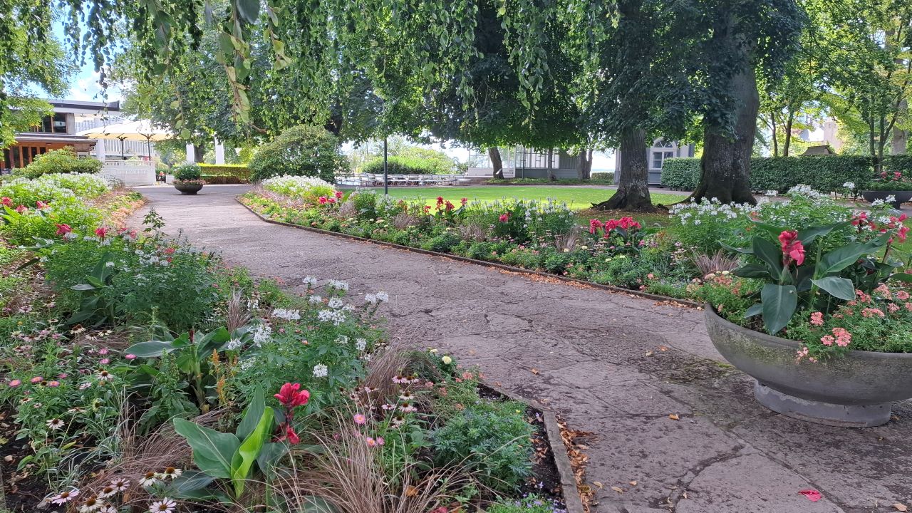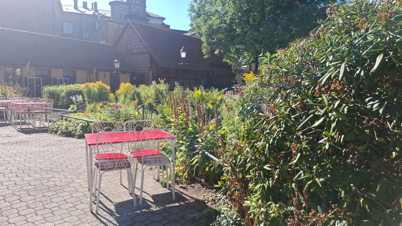 Dort angekommen geht es erst einmal ins Kaffee. Wir essen und trinken eine Kleinigkeit. Leider scheint es das Wetter nicht gut mit uns zu meinen. Es ist schon ziemlich dunkel am Himmel. Kurz nachdem wir den Schlossgarten betreten beginnt es auch zu regnen. Also stellen wir uns erst einmal unter. Eine feine kleine Gartenanlage will aber erkundet werden. Das Schloss kann man nicht besichtigen. Nachdem der Regen aufgehört hat schlendern wir durch die wirklich schön angelegten Gartenteile.