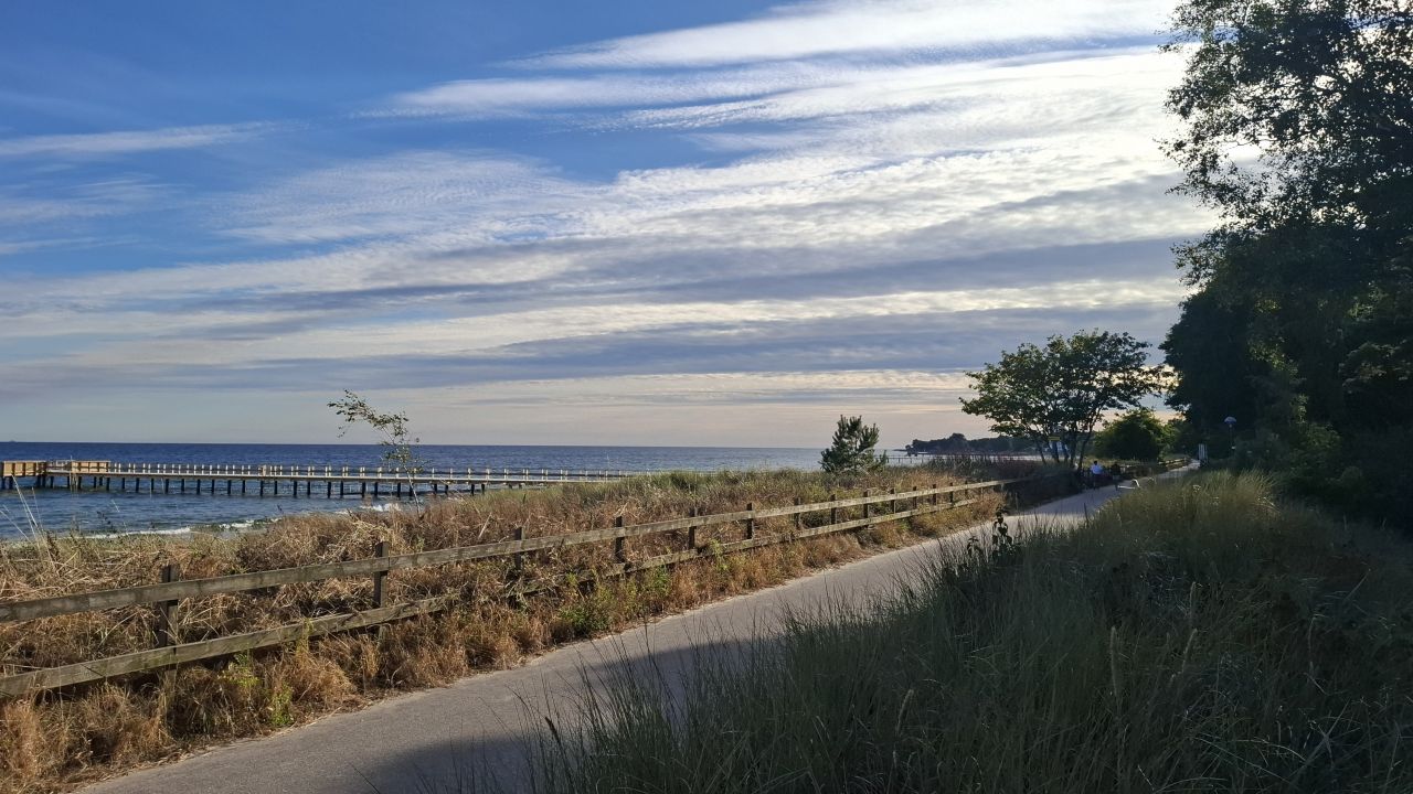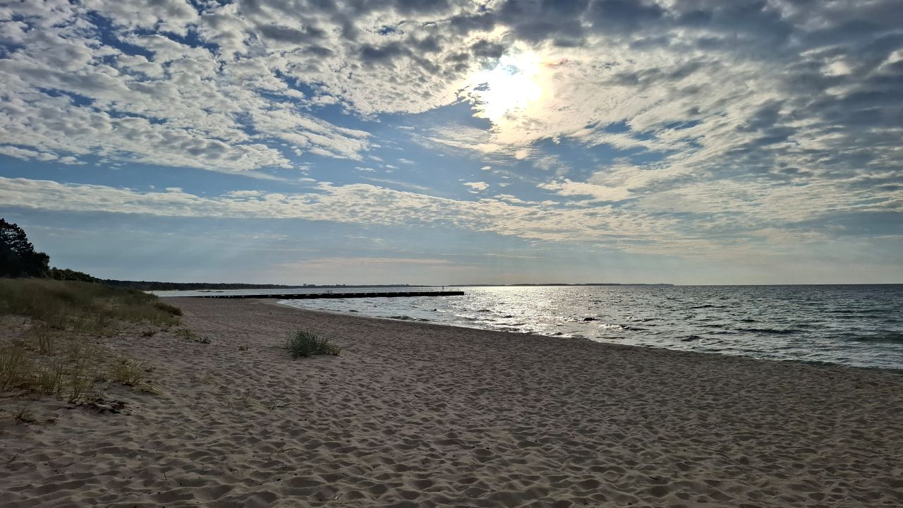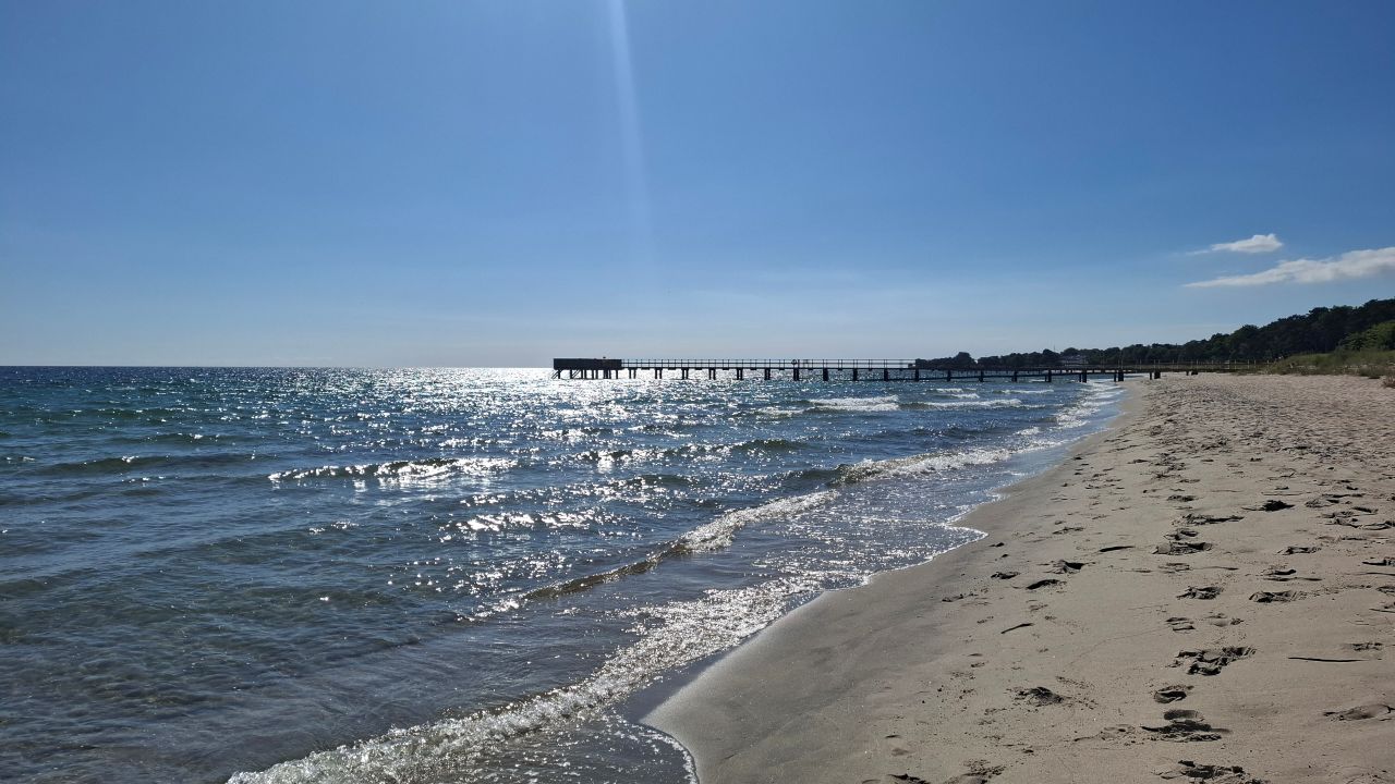 Nach einer kurzen Verabschiedung von der Oma und einer Aufstockung unserer Verpflegung geht es gen Norden. Wir fahren nach Warnemünde. Parken gibt es in der Nähe unserer Ferienwohnung von vor Jahren. Nun erst einmal am Strand entlang zum Strom und ein Fischbrötchen essen. Lecker! Es ist ganz schön voll hier. Die Temperaturen sind angenehm aber der Wind geht und die roten Fahnen sind gehisst. Ein kleiner Einkauf bei Skandik vervollständigt meine Garderobe. Wir suchen uns einen Platz zum Kaffee trinken. Wir werden fündig in der Hafenliebe. Es gibt Kaffee und Cheesecake und danach noch ein Glas Rotwein. Dann holen wir uns nochmals Fischbrötchen zum mitnehmen. Wir holen die Stühle aus dem Auto und setzen uns an den Strand. Ein paar mutige gehen baden.